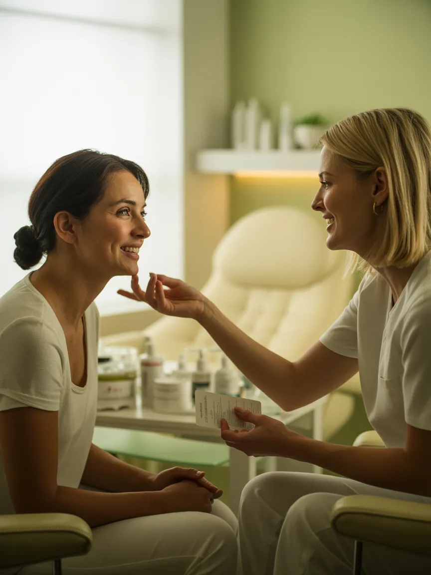 When you arrive, we'll take time to learn about your skin history, concerns, and goals. No rushing, no judgment. Just a conversation about what you're experiencing and what you want to achieve.